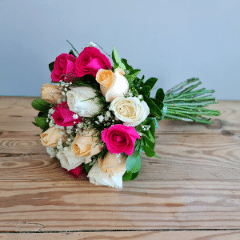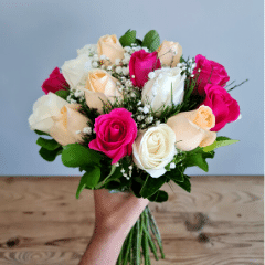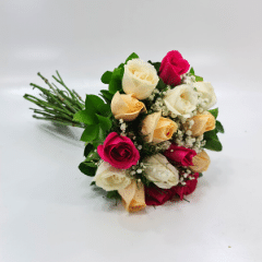 Mistura de três cores de rosas, significando carinho, admiração e respeito nesse buquê com quinze lindas flores, embalado para presente.