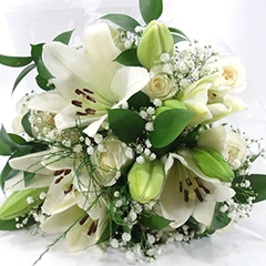 Este sereno buque, traz harmonia de pureza, paz e frescor. Com lírios brancos simbolizando a pureza da alma, rosas brancas representando amor e alstroemérias brancas transmitindo a serenidade e elegância, este buquê é uma expressão de paz. Quinze hastes de flores que encantam os sentidos e iluminam qualquer ocasião especial com sua beleza atemporal.