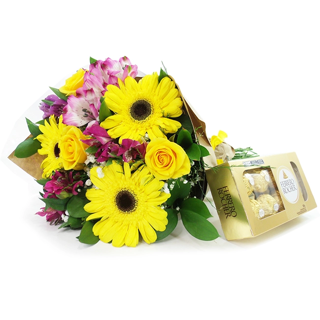Um lindo apanhado de flores amarelas e liláses (10 hastes entre gérberas amarelas, rosas e alstroemérias) . Expressam energia positiva, juventude, prosperidade e sucesso! Acompanha um delicioso chocolate Ferrero Rocher