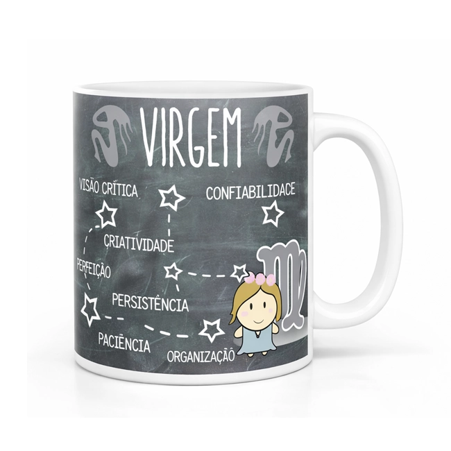 Caneca exclusiva do signo de Virgem com as principais características, a constelação e o símbolo do signo para você surpreender!