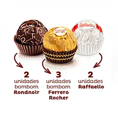 Sabor Ferrero Rondnoir: Chocolate amargo com recheio cremoso e pérola de chocolate. Sabor Ferrero Rocher: Chocolate com recheio cremoso de avelã, wafer crocante, com pedaçõs de avelã. Sabor Raffaello: Amêndoa dentro do recheio cremoso, envolto de casquinha de wafer crocante, coberta com flocos de coco.