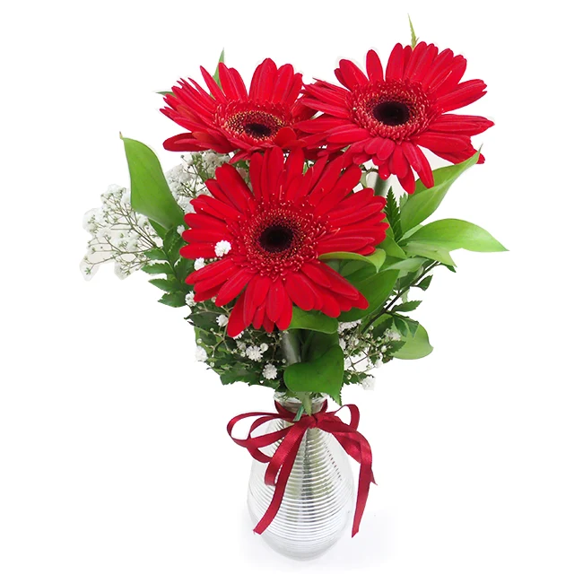 Trio de gérberas vermelhas num mini vaso bem fofo!