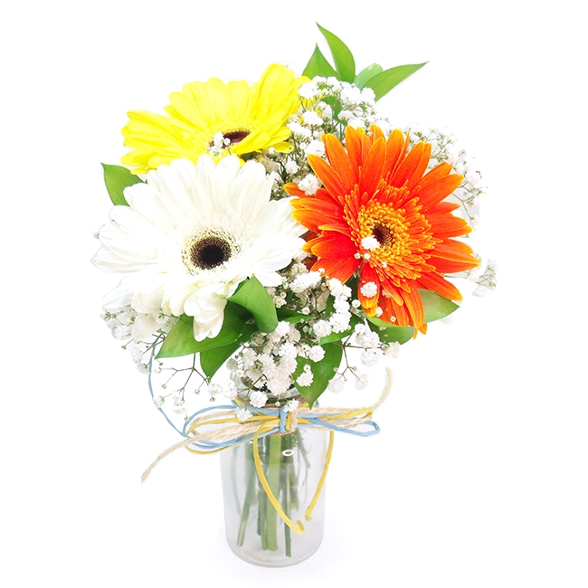 Trio de gérberas coloridas em um mini vaso charmoso.