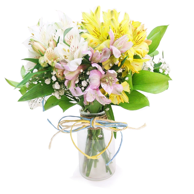 Pequeno e delicado vasinho com alstroemérias coloridas.