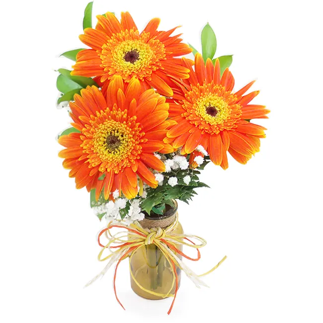Trio de gérberas laranja num mini vaso bem fofo!