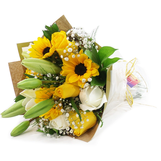 Este buquê amarelo e branco é uma radiante combinação de lírios elegantes, girassóis vibrantes, flores do campo delicadas e rosas clássicas. Com sua mistura de tons solares, o buquê transmite alegria e serenidade em igual medida. Os lírios trazem sofisticação, enquanto os girassóis adicionam um toque de energia e as flores do campo, uma suavidade natural. Finalizado com as rosas brancas, este buquê é perfeito para iluminar qualquer ambiente ou expressar sentimentos de carinho e esperança em ocasiões especiais.