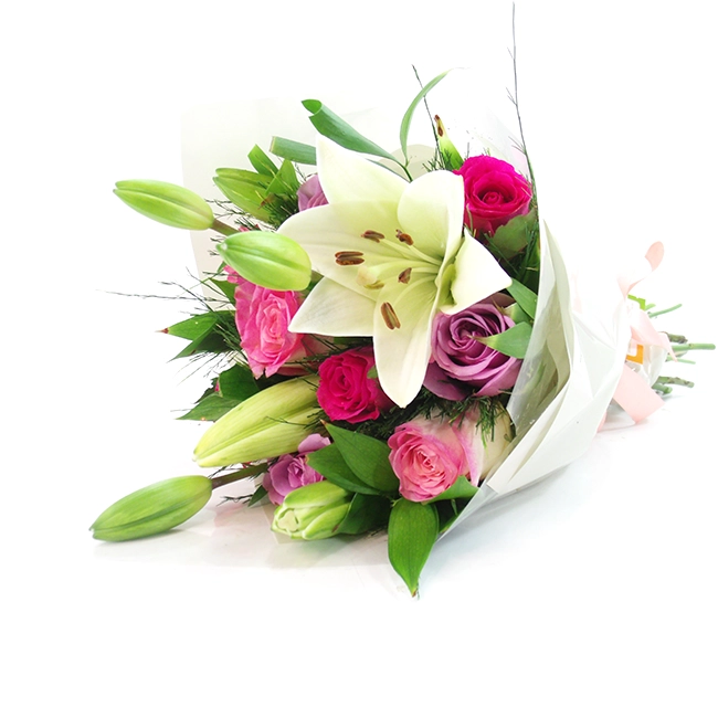 Os lirios e rosas em tons de branco, rosa e lilás se complementam nesse buquet de 10 hastes que expressa amor, carinho e admiração com muita sofisticação.