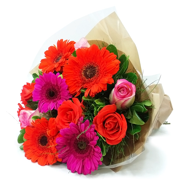 Geéberas e rosas em perfeita combinação de cores vibrantes para expressar muita felicidade!