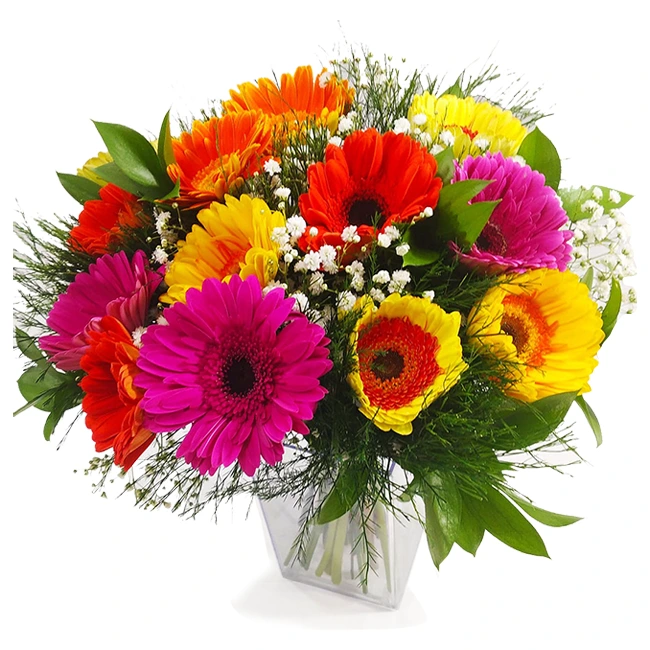 Lindo buquet com doze gérberas coloridas em vaso de acrilico.