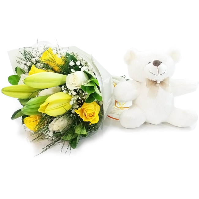 Os lirios amarelos e as belas rosas brancas e amarelas compõem esse buquet que expressa felicidade, harmonia e prosperidade com sofisticação junto com um fofo ursinho de pelúcia.