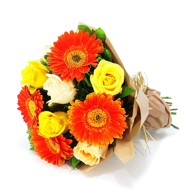Um buquê cheio de energia com gérberas e rosas nos tons de amarelo, laranja e champagne. Presente perfeito!