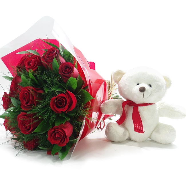 Lindo buquê com 12 rosas nacionais vermelhas e ursinho de pelúcia.